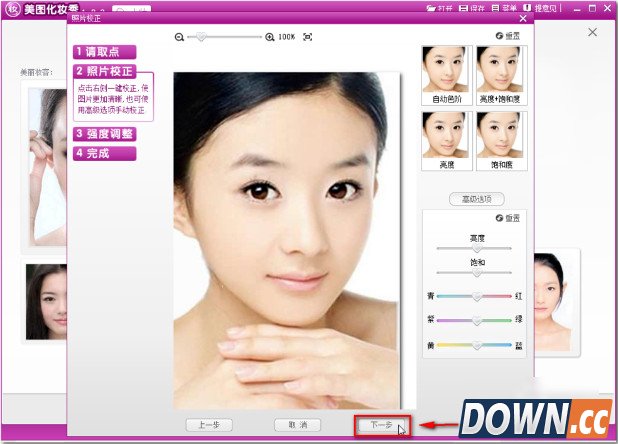 5、在弹出的窗口中调整照片的亮度和饱和度,在这里可以直接单击下一步