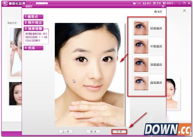 6、在弹出的窗口中美化一下脸部皮肤,此步可以直接单击完成按扭单,击完成后,就可以化妆照片了