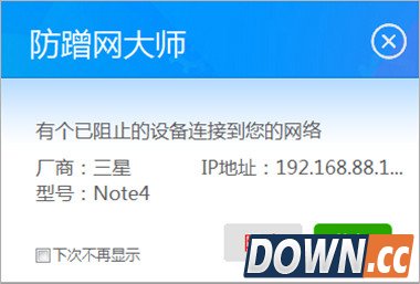 这个图标开机就有了,关闭主界面它也不会消失。所以呢,防蹭网大师会默默保护咱们滴。其实,小编还发现一个秘密。根据小编自己的测试结果,就算这个图标不在了,被阻止的设备还是不能上网,小编也很奇怪,不知道这个软件是怎么搞定的。 小技巧二:不再显示提示框 防蹭网大师有一个比较人情化的设计,就是有新的设备连到你的WIFI,它会跳出一个窗口,提醒一下你。小编测试发现,新的设备和被阻止的设备上线,防蹭网大师都会提示,新设备肯定是需要提醒的,但是已经阻止的设备也提醒,有点讨厌。后来小编发现,新设备的提示和已阻止设备的提示不一样,已阻止设备的提示框左下角有一个“下次不再显示”的框框,有木有?请看下面的截屏