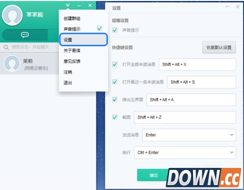点击菜单中的设置,可以看到对于易信的很多快捷键操作,如打开全部未读消息,弹出主界面,截图等