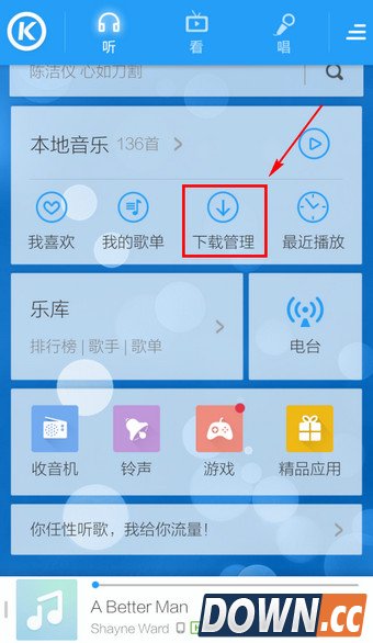 1.打开手机酷狗音乐,选择【下载管理】