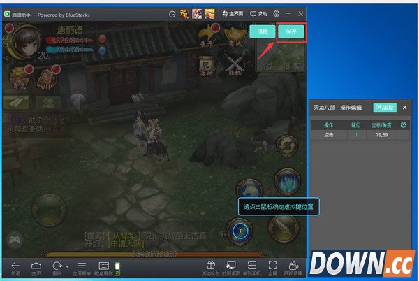 1)、鼠标左键点击=设置的该键位为点击屏幕 2)、鼠标左键点击拖动=设置的该键位为拖拽屏幕(小贴士:向左拖动表示该键位是向左拖动屏幕) 3)、右键右键点击拖动=设置的该键位为倾斜屏幕(小贴士:向左拖动表示该键位是向左倾斜屏幕 4、键位都设置好后,点击右上方的保存:
