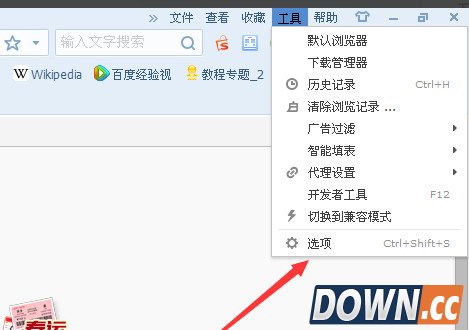 1、打开你的搜狗浏览器,点击上边的”工具“的选项卡,我们找到最后的”选项“设置