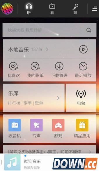 手机酷狗音乐在小伙伴们之间相当流行,除了最基本的听歌外,各种玩法也层出不穷。比如你厌倦了默认的皮肤背景,你就可以更换系统推荐的其他皮肤背景甚至自己自定义,从而让你的手机酷狗音乐更有个性。 如果你还不知道手机酷狗音乐怎么改皮肤背景的话,下面的操作方法对你可能有用哟! 1.打开手机酷狗音乐,点击右上角的【菜单】