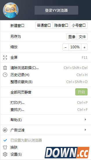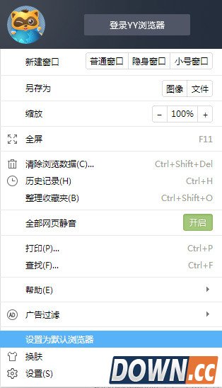 步骤很简单,我们打开yy浏览器,点击YY头像,在下拉中就会出现“设置为默认浏览器”。可能会有安全软件提示你,有文件正在修改你的设置,直接点击“允许”即可