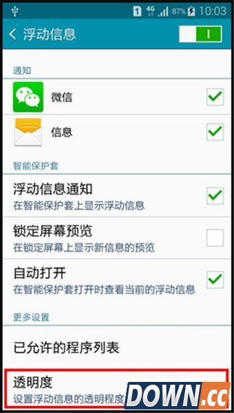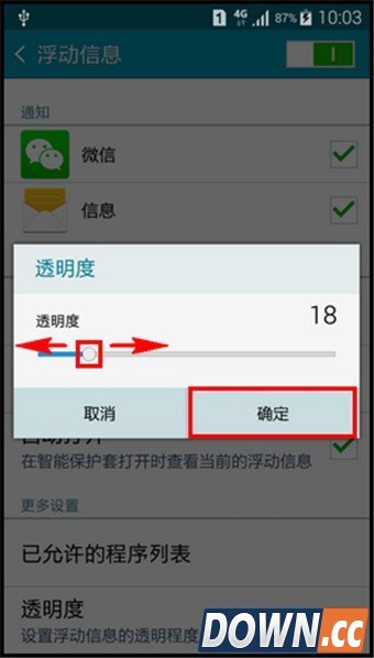 11.将【透明度】的滚动条向左或向右滑动,可以调节浮动信息的透明度,调整完成后,点击【确定】。