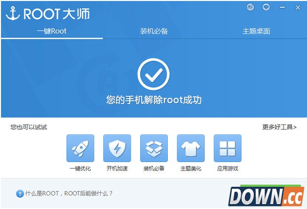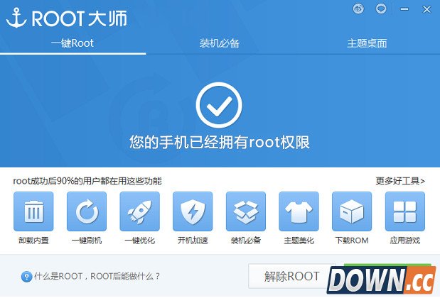 解除root之后,你可以干什么? ROOT权限解除后,你的手机的超级权限也被关闭了,也就意味着不能更改手机的系统文件。同时不能刷机了,但别担心这样也能防止自己手贱乱删除系统软件。 |