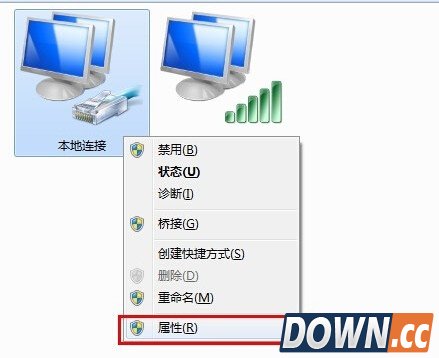 5、右击“本地连接”或“宽带连接”图标,从其右键菜单中选择“属性”项。