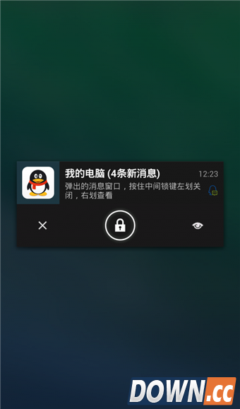 5.以QQ为例,当QQ有新消息时,手机屏幕会被自动唤醒,并弹出提醒窗口,点击该窗口的确认按钮,向左向右滑动即可关闭提醒或打开查看(QQ V5.0后已支持锁屏弹窗消息)