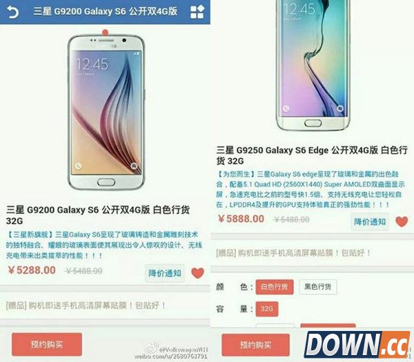三星Galaxy S6 Edge Galaxy S6售5288元 不仅如此,此次疑似京东商城的预售页面还同步泄露了三星Galaxy S6的行货价格为5288元,但仅有白色版本可选,同样为双4G公开版本。不过,该价格相比欧洲的价格却似乎要稍微贵一些。因为根据三星荷兰官方商城此前公布的预售页面显示,三星Galaxy S6的32GB版本价格为699欧元(约合人民币4900元左右);而64GB版本则定价为799欧元(约合人民币5600元左右),但暂时没有公布128GB版本的价格。