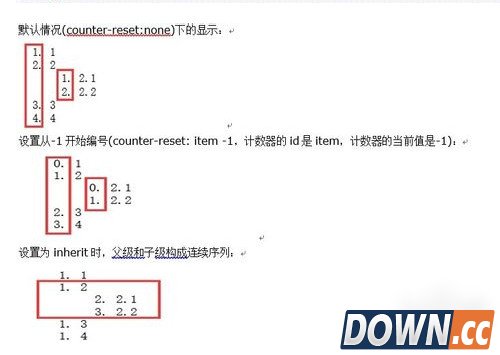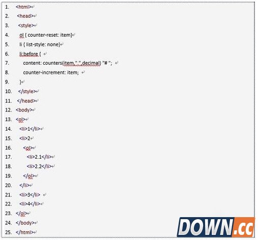 下面通过counters方法将所有的计数器显示,以圆点(.)分隔,list-style-tyle为decimalcontent: counters(item,".",decimal) "# ";