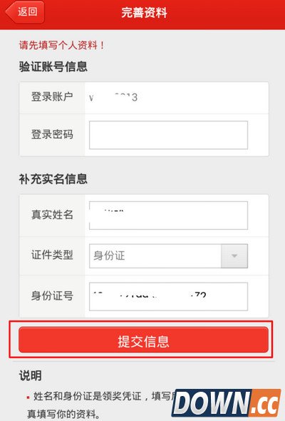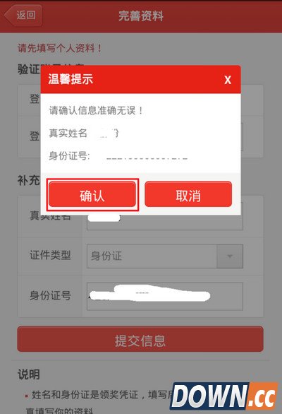 4、点击下一步之后,进入完善个人资料,进行实名认证,填写完成之后,点击提交信息,弹出确认框,点击确认完善资料。
