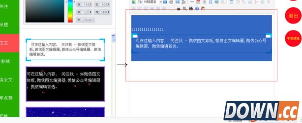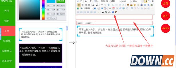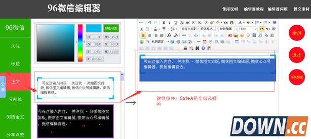 以上图片,就是昨天有个朋友编辑的时候遇到的问题,原本是按照流程 全选(Ctrl+A)——复制(Ctrl+C)——粘贴(Ctrl+V) 到微信公众平台里面,但是无论他怎么做都会出现问题,本身素材在这个添加时没有错误了,就是复制的时候 没有复制完整,就算全选也是没法复制的,那么如何才能解决,就是小编告诉大家的。 首先大家进入96微信编辑器,选好自己的素材,不要快速的点击选中素材进入右边的编辑框,大家可以可以再右边的编辑框架里面从上面打点空白区域或者打个数字也行,就是隔开的意思。然后在选中素材,进入右边的编辑框。如下图: