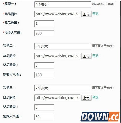 4、填写活动设置与奖项设置。注意关键词和经纬度的设置,完了点保存继续下面的填写,温馨提示:推荐每个奖项的人气值最好从小到大进行设置。奖项最多设置4个。单个奖项参数请填写完整,否则前台将不予显示。奖品图片宽高比例请尽量一致