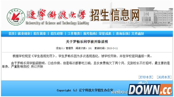 之前,有网友发现辽宁科技大学招生信息网上出现了一条《关于罗畅乐同学被开除说明》,引发热议。 开除理由很是奇葩:“由于罗畅乐同学脑袋聪明、口齿伶俐、但是每次都要吃三碗,且伙食费拖欠了两个月,见到校长不打招呼,最主要的是单身,严重影响我校 所以开除”。