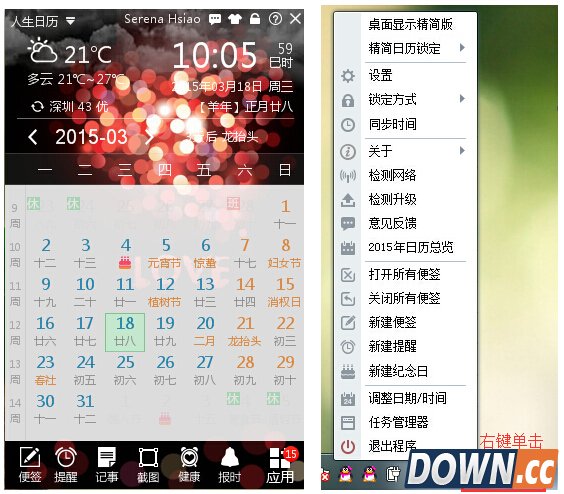 此外,你还可以利用该便签快速打开所有便签、新建便签、新建提醒、新建纪念日……你想要的便捷功能,人生日历都能够为你开启。 在快节奏的今天,随手可利用的快捷功能能够给你的生活、工作带来很多便利。只需右击时间任务栏,你就可以得到很多快捷功能,快速玩转人生日历。 还等什么?马上下载人生日历来玩转吧! |