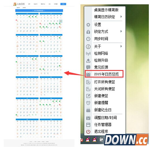 又或者,你想查看全年日历,但如果用人生日历一页一页的翻月份又太过折腾且不直观。点击时间任务栏,选择2015年日历总览,即可打开2015年的全年日历,查看任何一个月份都非常方便。