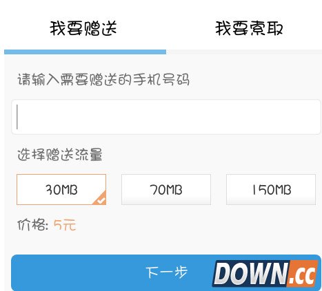 6、进入后,有“我要赠送和我要索取”两个选择。选择“我也赠送”,也就是你要送给别人流量包。填入,你送的人的手机号码,选择流量包数额。点“下一步”。就完成了。你的朋友马上就会收到你送的流量。费用是从你的手机话费扣除。
