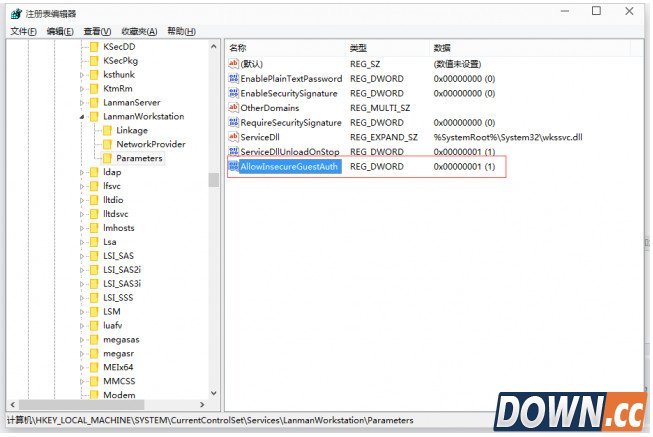 3、创建DWORD值并命名为AllowInsecureGuestAuth值为1即可