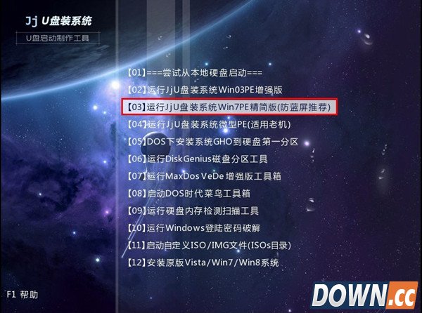 电脑出现故障是很常见的事情,如果你不是技术控,弄不明白故障出现在哪的话,只要不是电脑硬件问题,都可以通过重装系统来解决,而且不需要光驱和系统盘就可以快速重装win7系统,以下是图解教程,不会的可要认真学习一下! 一、准备 U盘一个、启动U盘制作工具——JJU盘装系统、GHOST版WIN7系统。 二、步骤 1.使用JJU盘装系统将U盘制作成启动U盘,制作教程: 2.将U盘插上电脑,从U盘启动电脑,进入U盘菜单选择界面,选择【01】【02】【03】都可以,这里选择了【03】,如图: