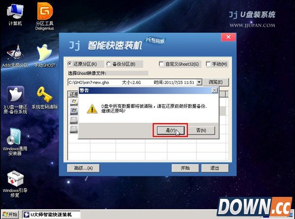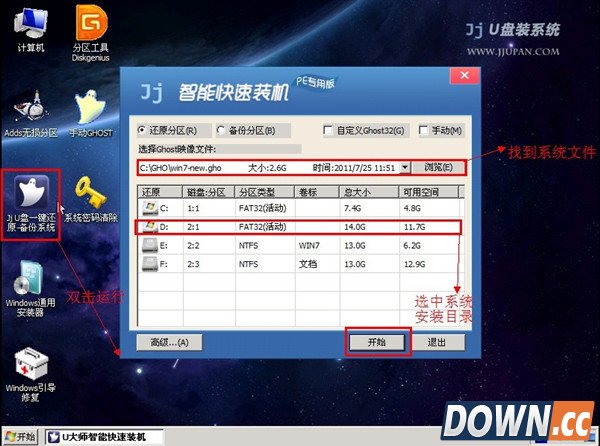 2.进入WINPE界面后,双击运行“JJU盘一键还原备份系统”工具,单击“浏览”,找到刚才准备的,并选择好系统安装目录,如图: