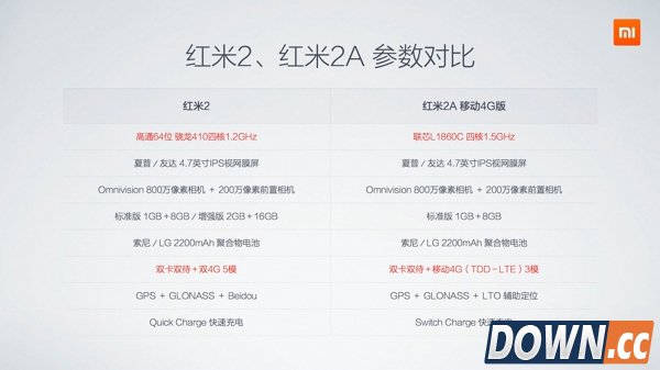 再具体看一下红米2A和红米2的对比,在屏幕、摄像头、存储等配置方面,红米手机2A与红米手机2保持一致:即夏普或友达等一线供应商的4.7英寸IPS全贴合720P屏幕,显示精度312PPI;8GB ROM和1GB RAM、以及最大32GB的microSD卡扩展、5片式镜头的800万像素背照式相机,红米手机2A保持了红米手机2的绝佳握感,重量上还要轻1克,仅132克。红米手机2A和红米手机2一样有5款不同颜色可选。