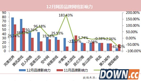 另外,根据比达咨询(BigData-Research,简称BDR)的长期跟踪监测,2014年度,畅游在网络品牌影响力方面,也一直落后于完美、腾讯、巨人、盛大等品牌。数据显示,2014年12月份,畅游由于用户关注度、媒体关注度以及新闻传播量等多项指标的下滑,其品牌影响力指数由同年11月的16.31环比下滑61.62%至6.26垫底,降幅最高。 |