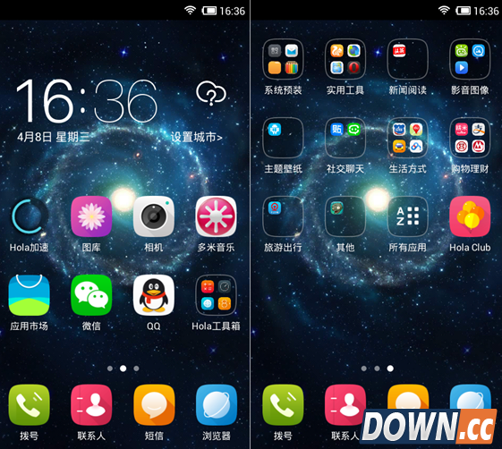 在桌面风格上,WP8桌面保留了原版Windows Phone90%以上的功能。左边是桌面主屏,右边是WP8风格的程序列表。主屏上磁贴式图标的设计非常有个性,不同大小、颜色各异的磁贴拼接在一起,给人一种很耳目一新的感觉。 与原生的安卓设计不同的是,WP8桌面摒弃了“抽屉式”的二级界面,减少了用户的划屏次数。磁贴式图标使让单屏的图标数最大化,提高了用户的操作效率。 2、Hola桌面