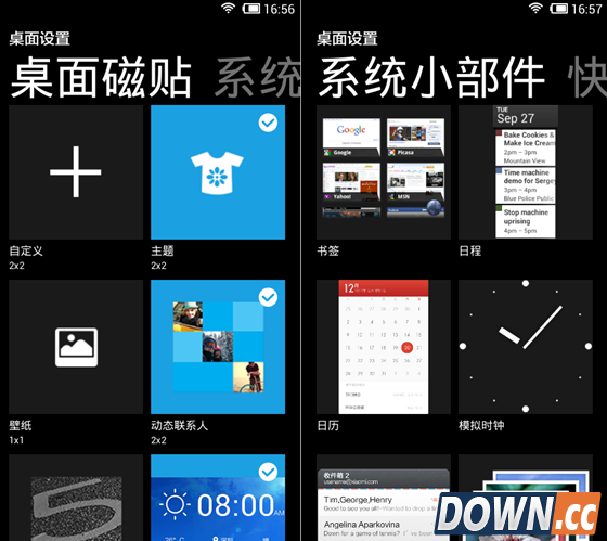 与WP8桌面一样,Hola桌面也抛弃了二级菜单,界面风格更加统一。与时下正流行的扁平化风格不同的是,Hola桌面的图标坚持拟物化风格,并使用了椭形圆角的设计,图标风格神似苹果的iOS6系统。 小结:在界面风格上,WP8桌面的逻辑清晰,设计简洁。而Hola桌面坚持拟物,在图标设计上也是可圈可点。所以就界面风格来说,WP8桌面和Hola桌面不分伯仲。 二、小部件对比 1、WP8桌面