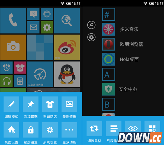 在设置项上,WP8桌面采用了类似于磁贴的按钮,设置功能一目了然。WP8桌面主屏菜单支持编辑模式、添加磁贴、桌面设置、主题商店、美图壁纸等功能。右侧的程序列表的菜单支持切换风格,列表排序、隐藏应用等功能。 2、Hola桌面