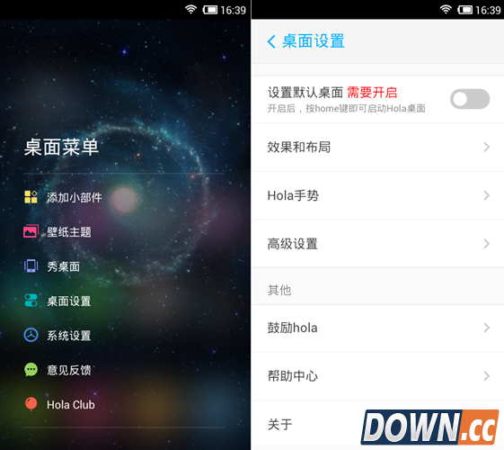 因为Hola桌面主打小巧实用,所以Hola桌面的小工具的数量虽然不多,不过也都是精品。Hola桌面有快捷方式、时钟、时钟天气、Hola加速,Hola直达等工具。 小结:从桌面小部件的数量和功能上来看,Hola桌面和WP8桌面差不多。不过,从小部件的个性化功能上来看,WP8桌面更胜一筹。所以这个环节,WP8桌面小胜Hola桌面。 三、设置项对比 1、WP8桌面
