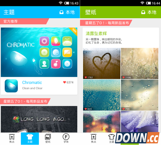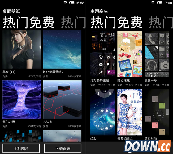 Hola桌面的设置项采用了层叠菜单风格,在Hola桌面的主屏幕的菜单栏有添加小部件、壁纸主题、秀桌面、桌面设置、系统设置等。进入桌面设置后,Hola桌面有设为默认、效果与布局、Hola手势、高级设置等功能。 小结:在功能设置方面,WP8桌面注重磁贴就是内容,把所有要设置项放在类似于磁贴的菜单栏上,而Hola桌面遵循的是传统Android Design风格。两款桌面各有特色,所以在这个环节,WP8桌面和Hola桌面打成平手。 四、主题壁纸对比 1、WP8桌面