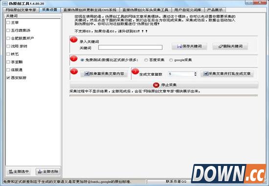 一、采集文章:石青伪原创工具,自带采集工具。首先,你需要在"采集设置"模块中录入需要采集的关键词。录入完成后,点击"保存关键词",该词汇就被保存下来,然后勾选它(默认是勾选的)。再选择是在百度还是google中采集。如果你是免费试用用户。就只能采用第一个"免费测试采集"。