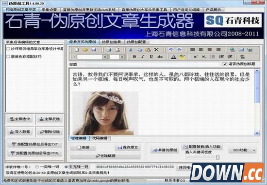 石青伪原创工具具是用来处理非原创的一款seo工具,用来帮助我们处理一些非原创文件,使文章让搜索引擎爬虫看起来像原创文章。软件支持中文和英文伪原创。 是一款专业且免费的伪原创文章生成器,其专门针对百度和google的爬虫习惯以及分词算法而开发,通过本软件优化的文章,将更受搜索引擎所青睐。 石青伪原创工具使用方法: