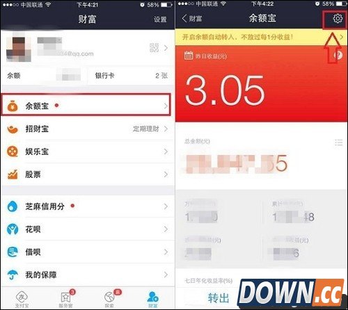 二、打开余额宝界面后,点击右上角【设置图标】进入余额宝设置,之后再打开【余额自动转入】设置,如图。