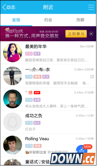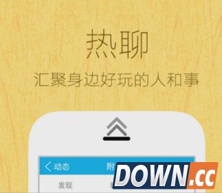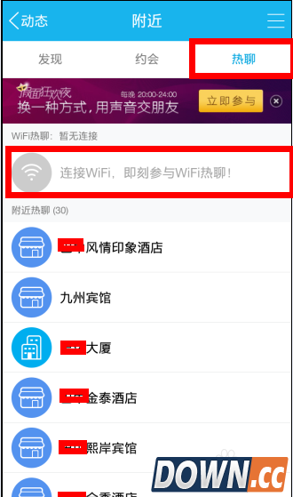 现在我们点击附近,在附近我们可以看到我们要找的热聊了,系统会提示热聊要在wifi下进行,我们不用管它,如图所示: