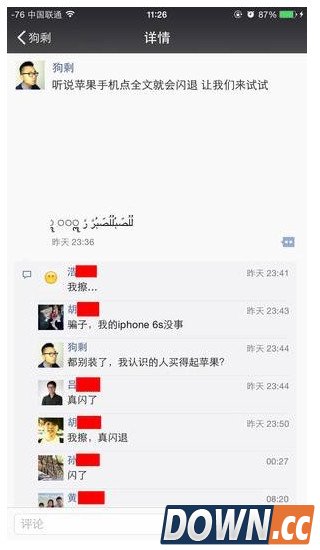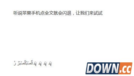最近用着iPhone的朋友不知道有没有遇到过这样闪退的时候,整天刷存在感的朋友估计一个个都蠢蠢欲动了吧。iPhone朋友圈闪也退肯定让不少朋友的存在感大大的提高了下面小编就为大家提供一段代码,让想提高存在感的朋友不妨试试哦 只要发朋友圈,iPhone用户点击就闪退 很简单,你只需要在你的朋友圈发一条简单的信息,吸引iPhone用户来点击,然后,就没有然后了,那堆iPhone的全部阵亡。无论他们心有不服,再次点击进来,也会同样遭遇闪退的尴尬。经过实测,几乎每一个点击查看该消息的iPhone用户都会闪退 不明真相的用户还以为是手机中了病毒,因为造成的闪退效果简直太真实了,完全就是暴力退出,没有任何办法,乍一看让人摸不着头脑,还有这么神奇的黑科技? 事实上,你只需要把如下信息收藏一下,复制到朋友圈发布即可。原理很简单,就是通过几个藏在底部的掩码让微信运行错误,直接暴力退出。信息内容如下:لُلُصّبُلُلُصّبُرً رً ॣ ॣ ॣ ॣ