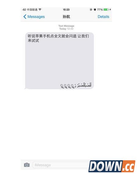 原理揭秘:并非iOS系统BUG,而是软件BUG 引起闪退的原因很简单,只有因为一串乱码而已。我们把这串代码复制出来,分别以邮件和信息的形式发送给iPhone,发现并没有出现闪退问题,说明这串乱码并不会对iPhone造成任何影响。不过由于闪退的都是微信、QQ、微博,所以,应该是这些社交软件对这串代码“过敏”,导致该软件直接闪退的。