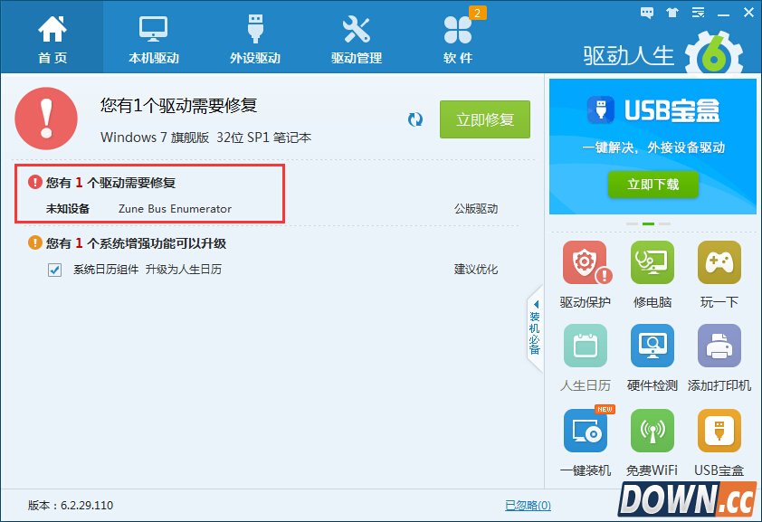 小编的设备管理器里未知设备有感叹号。打开驱动人生,检测电脑驱动,检测出一个未知设备需要修复,这与设备管理器中未知设备出现感叹号是相对应的。此时,按照驱动人生的提示,选择“立即修复”。