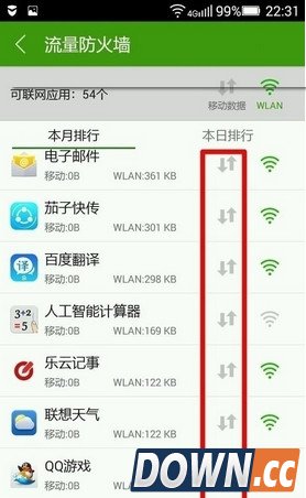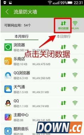 6、在“流量防火墙”中可以查看到所有应用消耗“移动数据”和“wlan”的情况。如果我们不想使用“移动数据”只要在“移动数据”上点击一下,就可以关闭移动数据