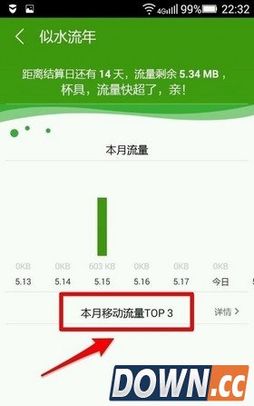 4、点击“似水流年”,会看到本月每一天的流量,点击正文的“本月移动流量TOP3”查看消耗流量前三位的应用。
