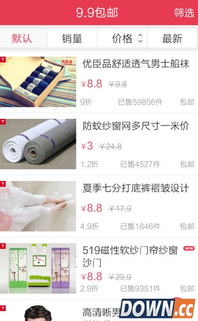 6、进去9块9包邮后,如下图所示。所展示的商品按默认或是销量等排序出来。