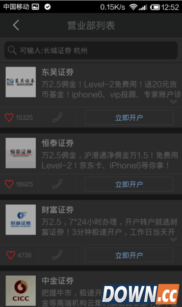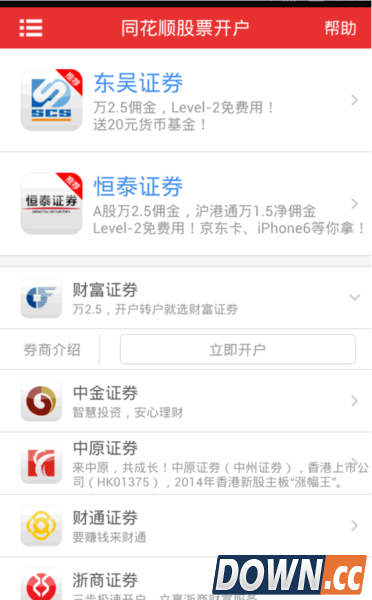 第二步:进入同花顺股票软件进入主界面,找到“开户转户”点击进入,找到你自己想要开户的证券商,点击“立即开户” 马上会提示你下载第三方app应用,点确定即可。