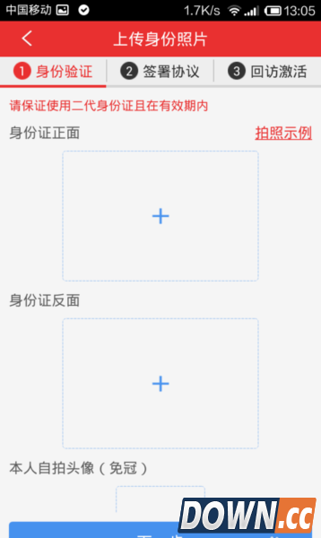 第四步:找到身份证正面、身份证反面、本人自拍头像(免冠)对应的加号,依次添加对应照片,点击“下一步”。