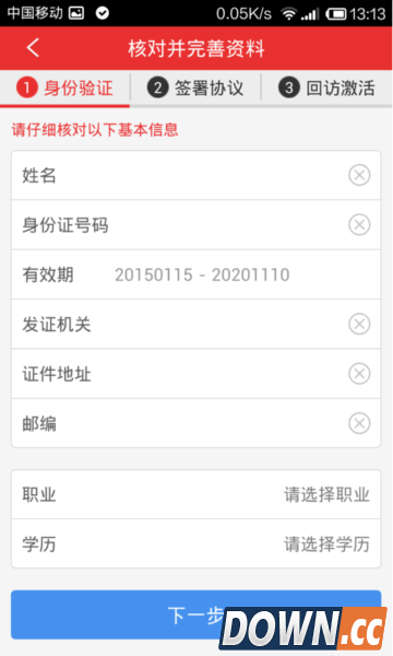 第五步:之后系统会自动识别个人信息并补全,如果没有自动识别或自动补全的信息有误,请手动添加或修改,确认无误后,点击“下一步”,接着营业部一项系统会自动选择,继续点击“下一步”。