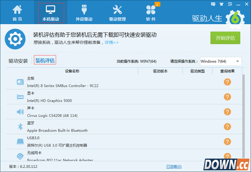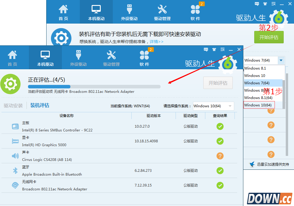 在“请选择操作系统”的下拉框中选择Windows10(64),因为小编的电脑是Win7(64)。然后点击“开始评估”就可以快速评估电脑了。
