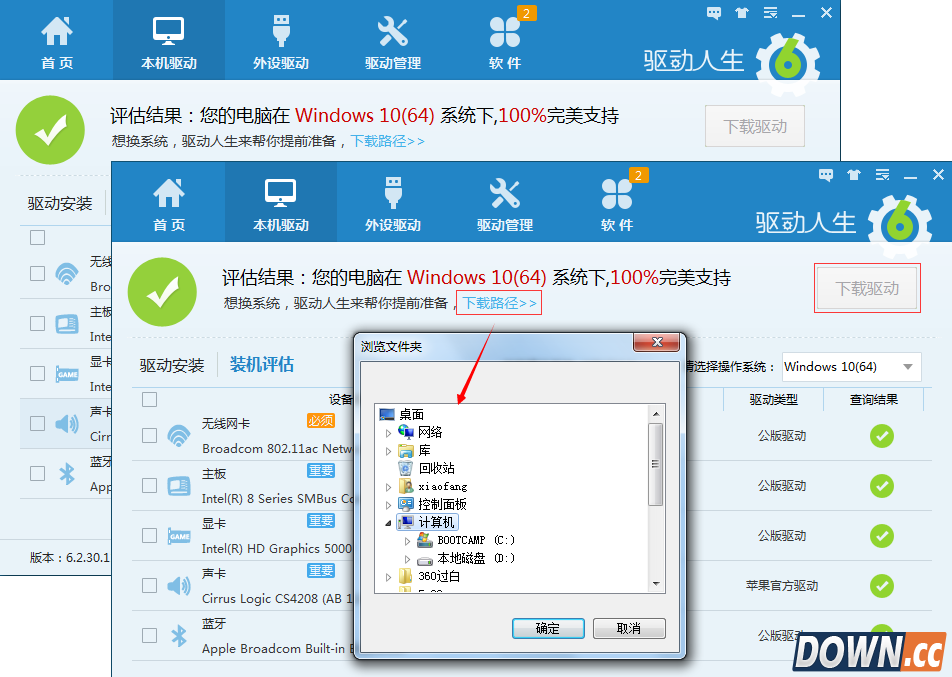 整个评估过程不超过5秒钟,您即可看到评估结果。如下图,小编的电脑100%支持Windows10(64)系统,这说明,小编的电脑如果升级到Windows10,是可以完美运行的。为了能快速安装好Windows10系统,驱动人生还支持让用户提醒下载好Win10驱动,打开“下载路径”,选择非系统盘的磁盘来保存Win10驱动,然后点击“下载驱动”即可将Win10驱动提前下载到电脑。这个功能的好处在于,当您新装Win10系统之后,只要用驱动人生网卡版将电脑的网卡驱动安装好之后,即可快速安装其他驱动,安装速度比原来可提升50%。