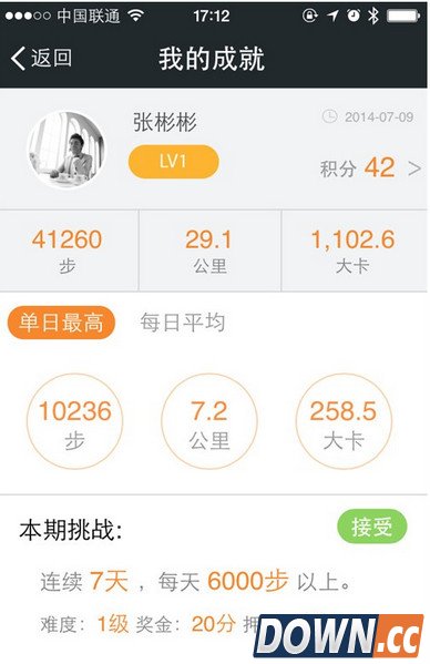 4、服务里面还将会有挑战任务,完成后会有奖金和积分,根据你级别的不同,任务的难易度也不同。上图是我最近行走步数最多的一天,可以看到超出预定指标170%。