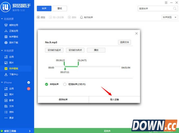 5、确定好铃声之后,直接点击下方“导入设备”就可以直接把自己制作的铃声导入到您的设备中。