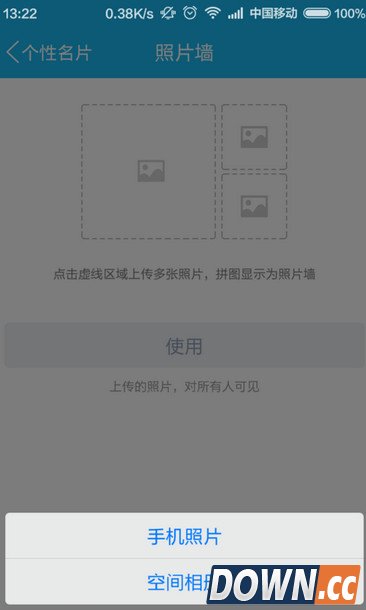 7、接下来就是选择照片啦,这里有两种上传方式“手机照片和空间相册”,顾名思义,我们既可以选择手机中的照片,也可以从QQ空间相册中调用照片来上传到照片墙,具体的选择就看大家个人的需要啦。